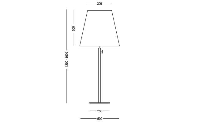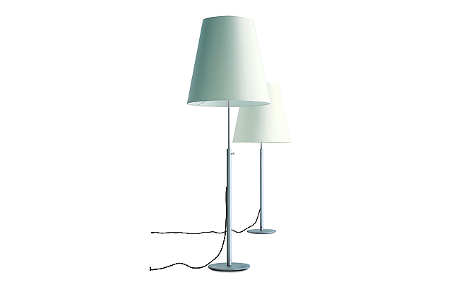 Торшер. Металлические части - лакированный алюминий. Регулируемая высота. Абажур из белого шелка. Напряжение 230 В. Освещение лампа макс. 100 Вт цоколь Е27.