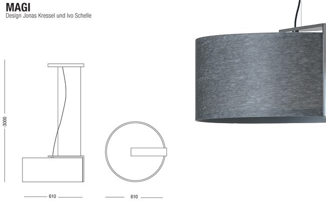 Свет → Светильники → ANTA → Magi Подвесной светильник. Металлические части - алюминий слегка матовый. Абажур - ткань белого или серого цвета. Напряжение 230/120 В. Освещение - 3 лампы макс. по 75 Вт цоколь Е27.