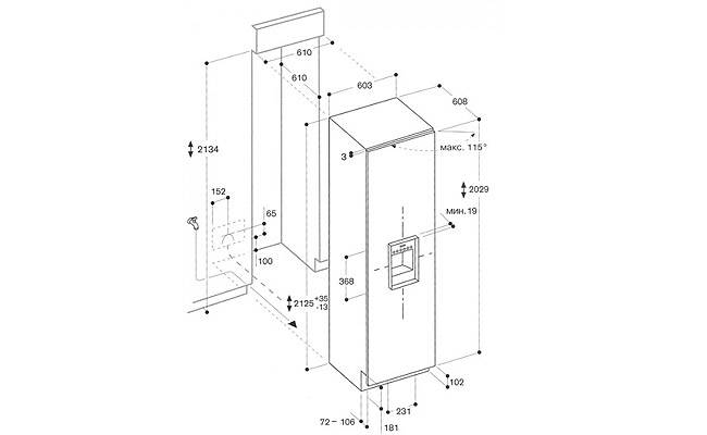 Встроено в морозильное отделение, с системой постоянной подачи воды.