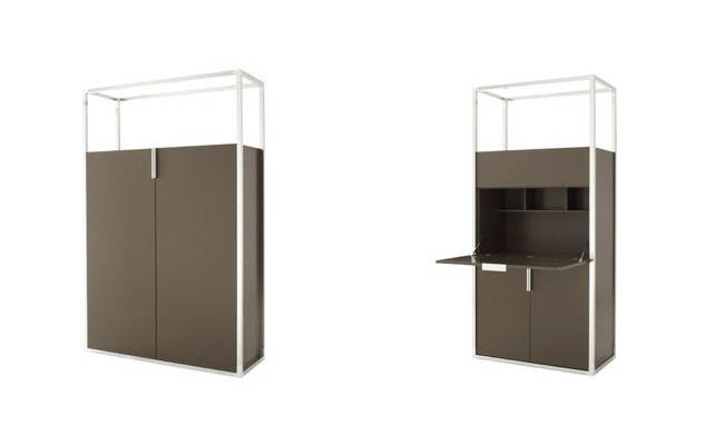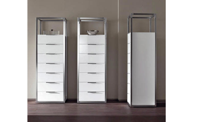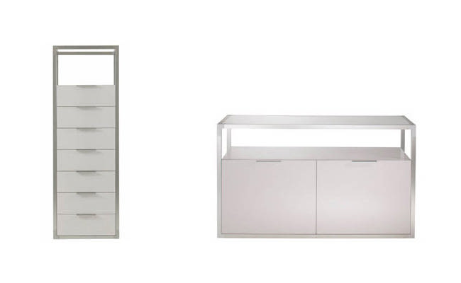 Программа элегантной корпусной мебели, способной удовлетворить самые высокие эстетические запросы. В белом глянцевом лаке она выглядит современно, в натуральном или тонированном под эбеновое дерево дубе - в стилистике ар деко. Рамы смоделированы из блестящих алюминиевых профилей, соединенных на углах матовым алюминием. В программе представлены разные по высоте и ширине стеллажи, серванты, закрытый шкаф, комод, консольный столик, три обеденных, три журнальных и один письменный стол.
