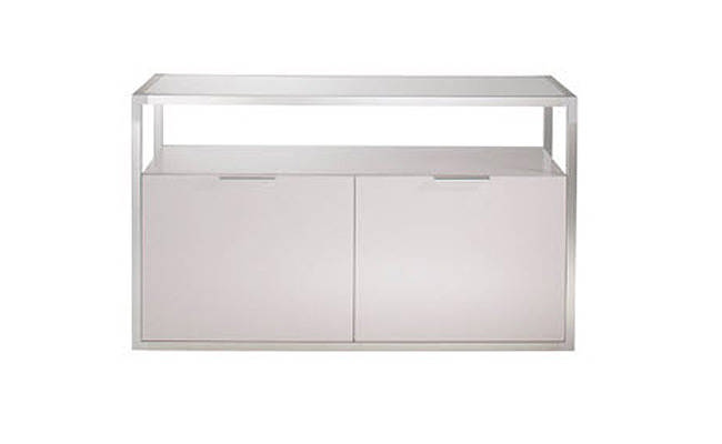 Мебель → Комоды → Ligne Roset → Dedicato Современные трех- и четырехдверные комоды в рамах из блестящего алюминия. За дверцами скрываются выдвижные ящики и стеклянные полки. Отделка: блестящий белый лак со столешницей из молочного стекла или дуб, тонированный под эбеновое дерево, со столешницей из антрацитового стекла.