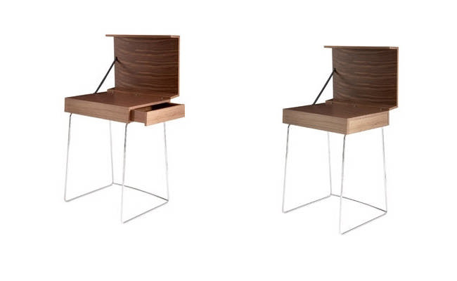Мебель → Офис → Ligne Roset → POM'S Этот элегантный и изящный письменный стол отличается крышкой и ящиком (шкафом) с правой стороны. Отделка на выбор клен или орех; внутренняя отделка ящика из натуральной кожи (клен) или черной кожи (орех); ремешок из той же кожи. Основание из хромированной стали. W 58 cm D 50/58 cm H 84 cm