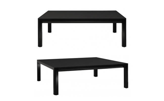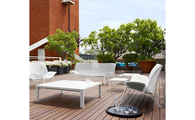 Уличная версия хорошо известных софы и журнального стола со столешницей из стекла, покрытого белым или черным лаком.