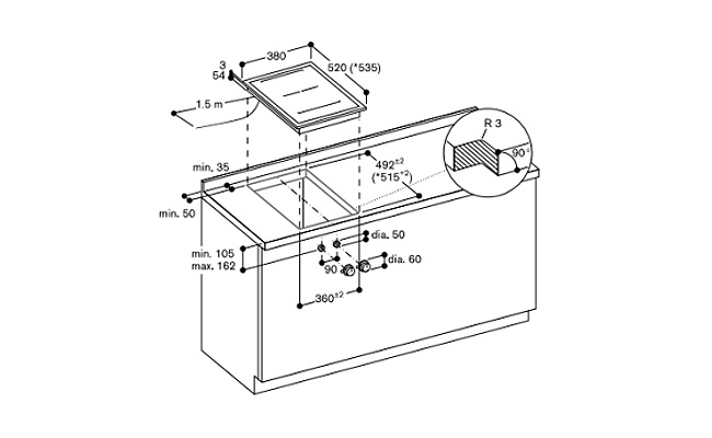 2 комбинируемые индукционные конфорки 19 × 23 см (2200 Вт, с функцией Booster 3700 Вт), при совмещении 38 × 23 см (3300 Вт, с функцией Booster 3700 Вт).