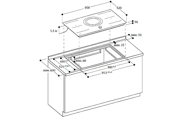 2 комбинируемые индукционные конфорки 19 x 23 см (2200 Вт, с функцией Booster 3700 Вт), при совмещении 38 x 23 см (3300 Вт, с функцией Booster 3700 Вт).