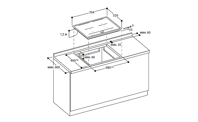 2 комбинируемые индукционные конфорки 19 x 23 см (2200 Вт, с функцией Booster 3700 Вт), при совмещении 38 x 23 см (3300 Вт, с функцией Booster 3700 Вт) Управление.