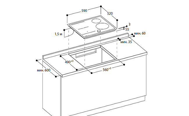2 комбинируемые индукционные конфорки 19 x 23 см (2200 Вт, с функцией Booster 3700 Вт), при совмещении 38 x 23 см (3300 Вт, с функцией Booster 3700 Вт). Управление.