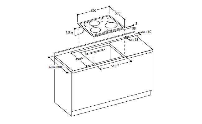 1 индукционная конфорка диаметром 18 см (1800 Вт, с функцией Booster 3100 Вт), с автоматическим расширением до 18 X 28 см (2000 Вт, с функцией Booster 3700 Вт). Управление.