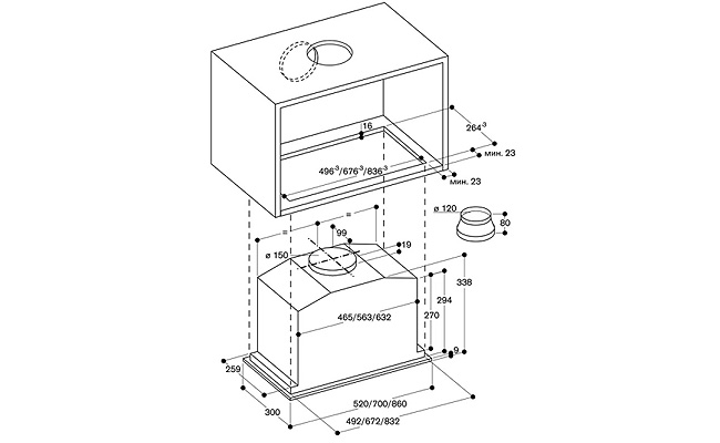 Полностью встраивается в подвесной шкаф.