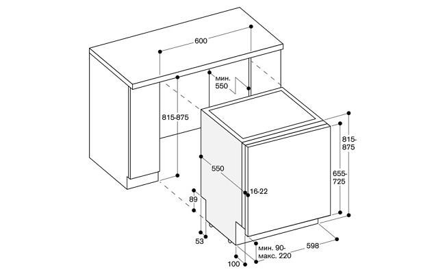 Для посудомоечных машин высотой 81,5 см: 27/25, 24,5/27,5 или 22/30 см соответственно