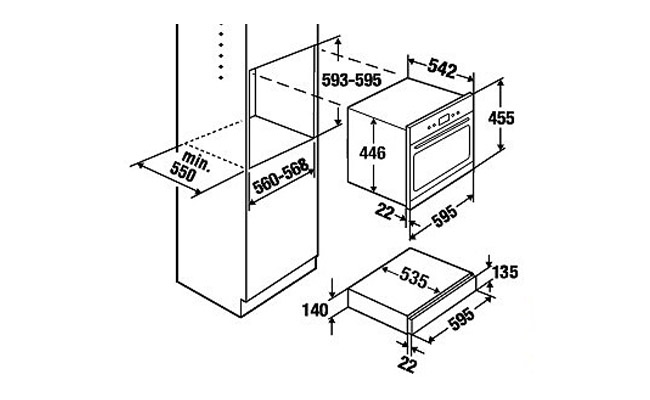 - Размеры ниши для встраивания, Ш х В x Г ≈ 560 х 595 x мин. 550 мм (включая прибор высотой 45 см)