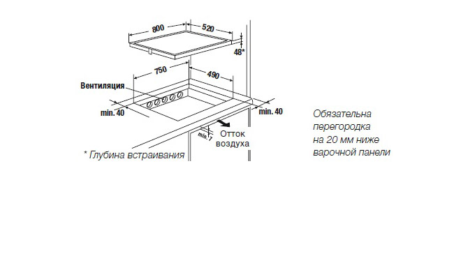 - Размеры ниши для встраивания Ш х Г ≈ 750 х 490 мм.