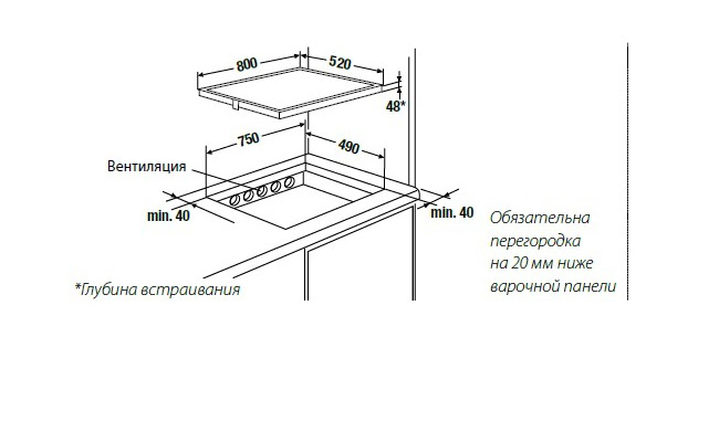 - Размеры ниши для встраивания Ш х Г ≈ 750 х 490 мм.