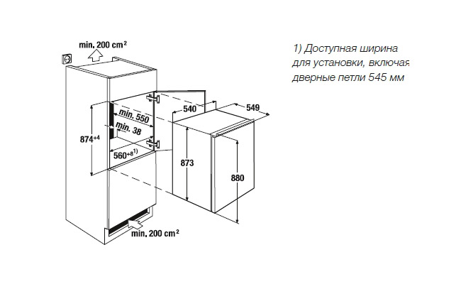 - Размеры ниши для встраивания Ш x В x Г ≈ 560 x 874 x 550 мм.