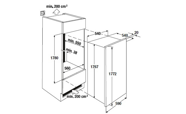 - Размеры ниши для встраивания Ш x В x Г ≈ 560 x 1.780 x 550 мм