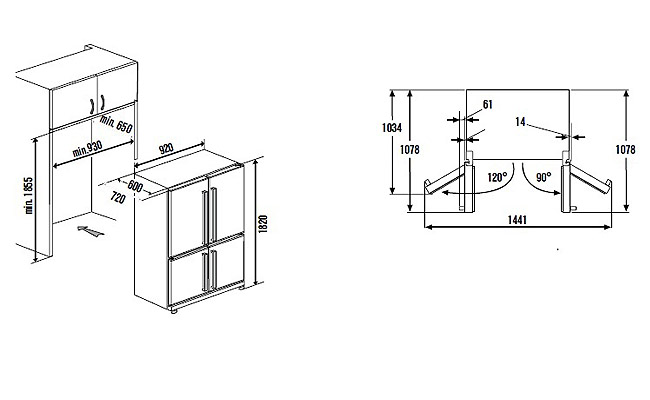 - Размеры прибора (без ручек) Ш x В x Г ≈ 920 x 1.820 x 720 мм.