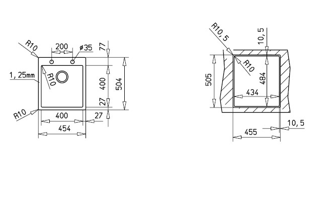 - Размеры чаши мойки Ш x Г ≈ 400 x 400 мм