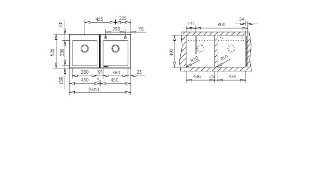 - Размеры чаши мойки Ш x Г ≈ 380 x 380 мм