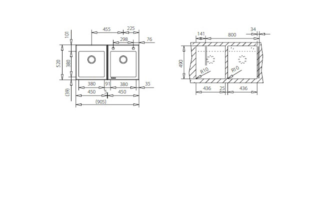 - Размеры чаши мойки Ш x Г ≈ 380 x 380 мм