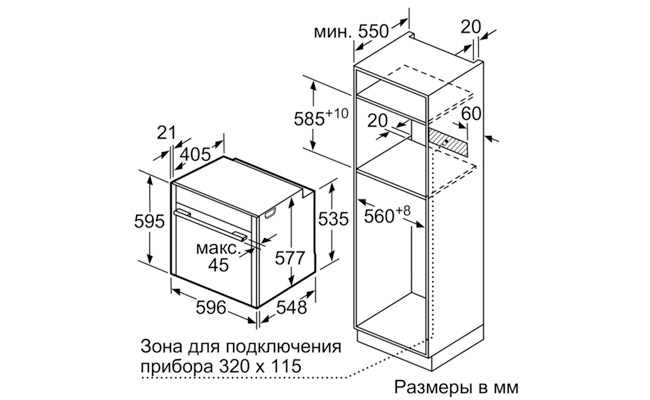 Размеры ниши для встраивания (ШхВхГ): 560 мм - 568 мм x 585 мм - 595 мм x 550 мм
