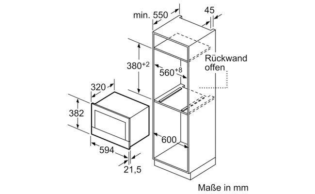 Размеры ниши для встраивания (ШхВхГ): 560 мм - 568 мм x 362 мм - 382 мм x 300 мм