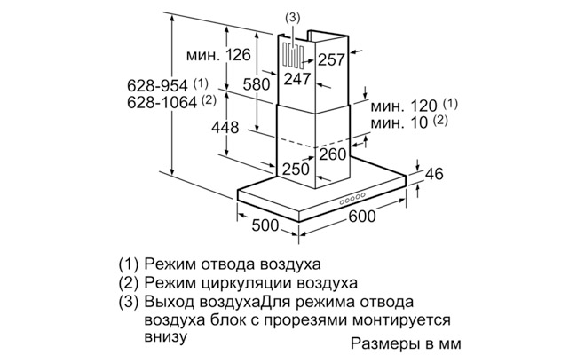 Размеры (отвод воздуха) (ВхШхГ): 628-954 x 600 x 500 mm