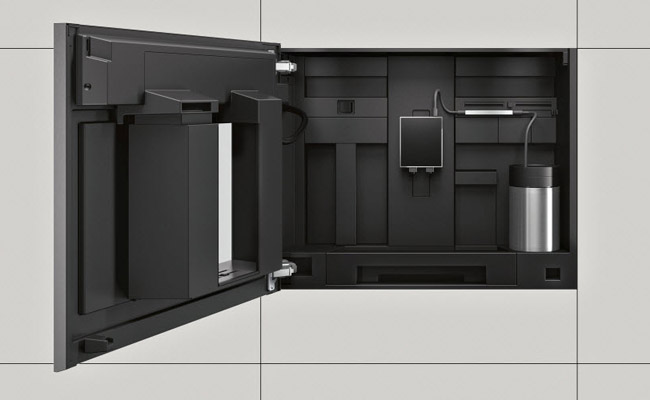 Контейнеры для воды, молока и кофе в зернах всегда легко доступны, но скрыты позади двери, таким образом кухня всегда выглядит чистой