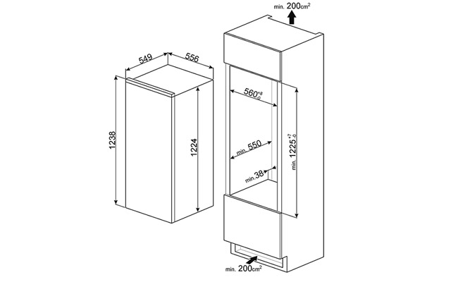 Встраиваемый однодверный холодильник, морозильное отделение сверху, 122 см Класс энергопотребления А++
