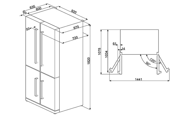 Для полного выдвижения внутренних ящиков необходимо открытие дверей холодильника минимум на 120 градусов (левая и правая дверцы – 261 мм)
