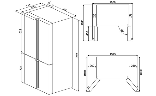Для полного выдвижения внутренних ящиков необходимо открытие дверей холодильника минимум на 120 градусов (левая и правая дверцы – 261 мм)