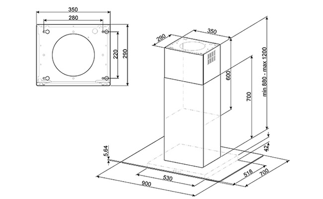 Вытяжка островная, 90 см, нержавеющая сталь + стекло.