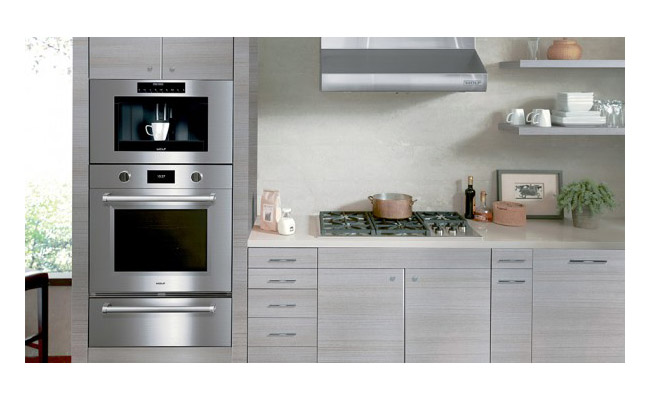 Впечатляющий духовой шкаф Wolf серии Proffesional с фирменными красными ручками.