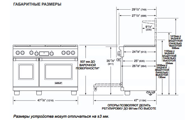 С совокупным полезным объемом в 150 литров отдельных духовых шкафов (малого и большого) Кухонные блоки Wolf шириной 1219 мм предлагают достаточное пространство для ваших кулинарных нужд. Широкая рабочая поверхность представлена в четырех конфигурациях и включает инфракрасный гриль и теппан, а также французскую поверхность. Большой электрический духовой шкаф наделен двойной системой конвекции, которая отвечает за равномерное распределение жара в каждом уголке камеры. Два вентилятора и четыре нагревательных элемента обеспечивают удобство для пользователя и превосходное управление десятью режимами приготовления. Сияющие галогенные лампы освещают красивый синий интерьер духовки.