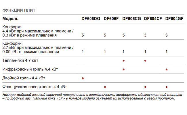 Режим томления на сверхнизком уровне пламени (True simmer) для всех конфорок и режим плавления (Melt) для маленьких конфорок