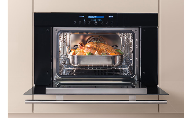 Восторг и удивление! Паровой шкаф с конвекцией создан, чтобы радовать поварскими возможностями. Его вы действительно будете использовать… использовать… и снова использовать. Его объем 50,9 литра, что на 25% вместительнее, чем имеют подобные ему приборы, и позволяет готовить объемные блюда или несколько одновременно. Например, можно запечь семикилограммовую индейку или утку с апельсинами.